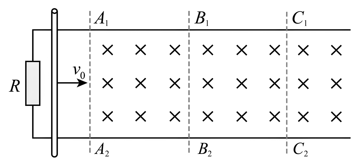 18、某电磁缓冲装置如图所示,两足够长的平行金属导轨置于同一水平面内,导轨左端与一阻值为R的定值电阻相连,导轨段与段粗糙,其余部分光滑,右侧处于竖直向下的匀强磁场中,一质量为m的金属杆垂直导轨放置,现让金属杆以初速度沿导轨向右经过进入磁场,最终恰好停在处,已知 , 金属杆和导轨电阻不计,下列说法正确的是( )A、金属杆经过时的速度为 B、在整个过程中,定值电阻R产生的热量为 C、在整个过程中,金属杆克服安培力做功等于电阻R产生的焦耳热 D、金属杆经过与区域,金属杆所受安培力做功大小相等