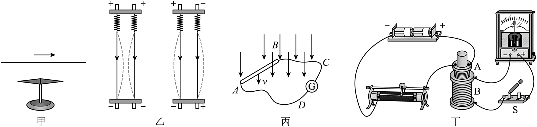 6、下列关于磁场、电磁感应的实验中,说法正确的是( )A、图甲中,小磁针发生偏转是因为电流周围存在磁场 B、图乙中,电流间的相互作用是通过电荷的电场产生的 C、图丙中,使导体棒AB沿着磁感线运动能产生感应电流 D、图丁中,只有闭合或断开开关瞬间能产生感应电流