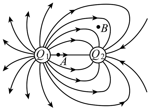 8、如图所示为一对不等量异种点电荷的电场线分布,下列说法正确的是( )A、Q1对Q2的静电力大于Q2对Q1的静电力 B、B处没画电场线,故B处电场强度为零 C、Q1、Q2所带的电荷量是元电荷的整数倍 D、根据电场强度的定义式可知,A处电场强度与试探电荷无关
