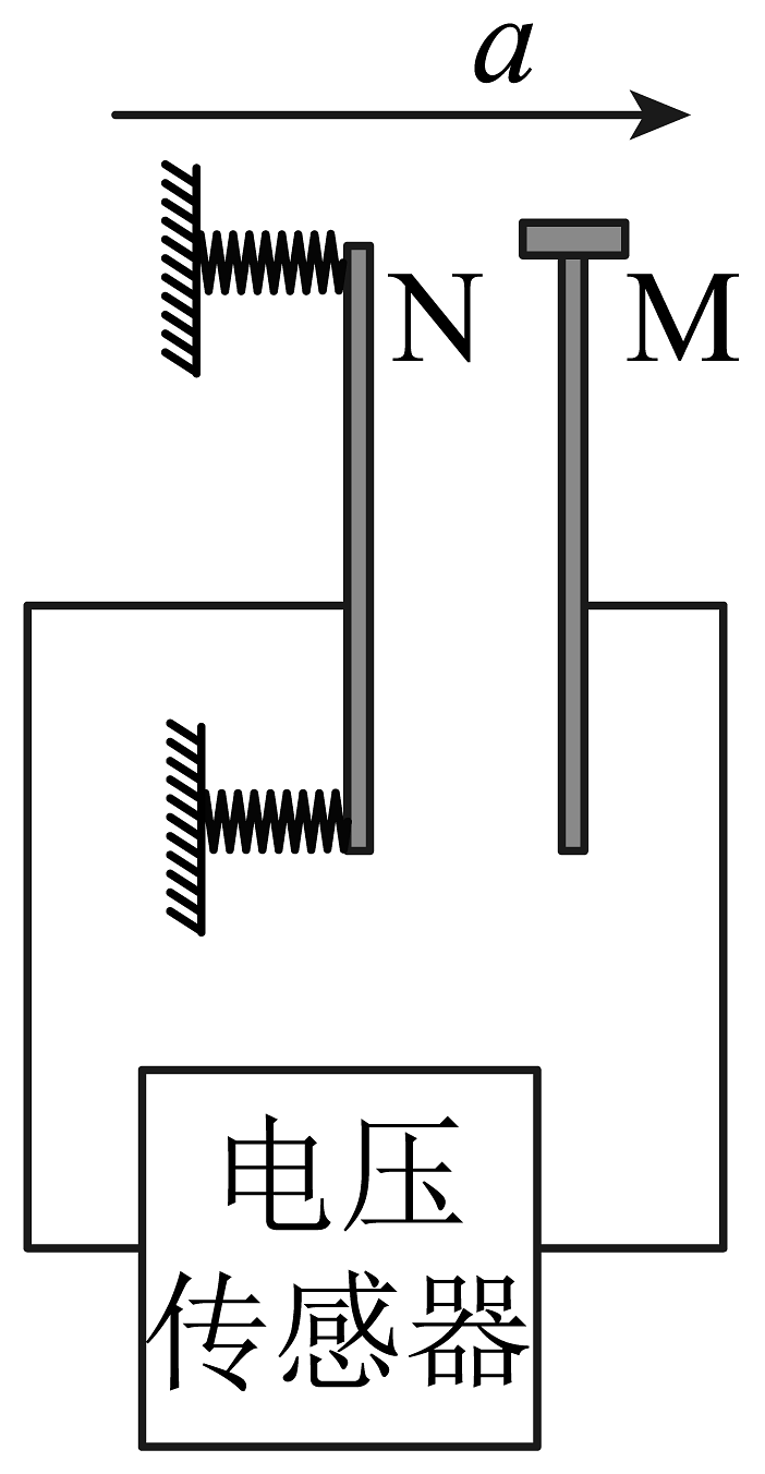 3、如图所示为某手机内部加速度传感器的俯视图,M、N为电容器的两极板,M板固定在手机上,N板通过两个完全相同的水平弹簧与手机相连,电容器充电后与电源断开。手机静止时,M、N间距离为d0 , 弹簧为原长状态,电压传感器示数为。不计摩擦,若手机在水平面内运动的加速度如图中所示,则( )A、M、N间距离将小于d0 B、电容器的电容变大 C、M、N板间的电场强度变小 D、电压传感器的示数大于U0