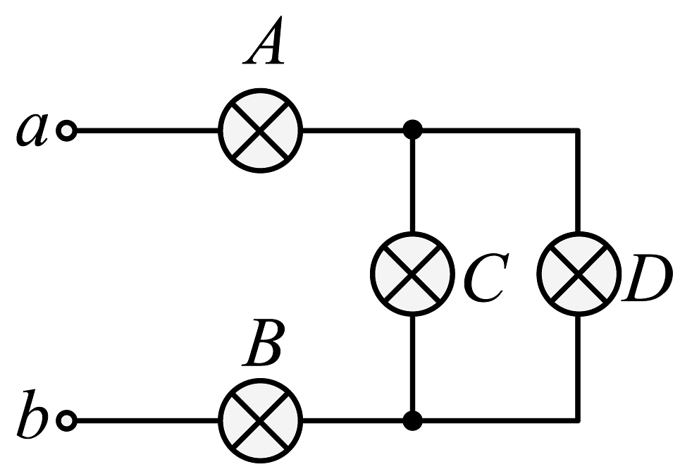 2、如图所示电路中,各灯泡额定电压和额定功率分别是:A灯“10V 10W”,B灯“60V 60W”,C灯“20V 20W”,D灯“20V 20W”。在a、b两端加上电压后,四个灯泡都能发光。比较各灯泡消耗功率大小,以下说法正确的是( )A、PB>PD>PA>PC B、PB>PD>PC>PA C、PB>PA>PD=PC D、PA>PC>PD>PB