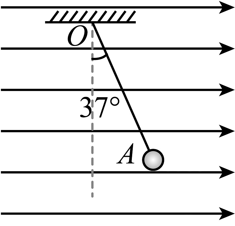 19、用一长L的轻质柔软绝缘细线,拴一质量为m、电荷量为q的小球,细线的上端固定于O点,现加一水平向右的匀强电场,平衡时静止在如图所示A点,此时细线与铅垂线成(g取 , , ),则:(1)、小球带何种电荷;(2)、求匀强电场的场强;(3)、若将电场反向,求小球从该位置摆到最低点过程电场力所做的功。