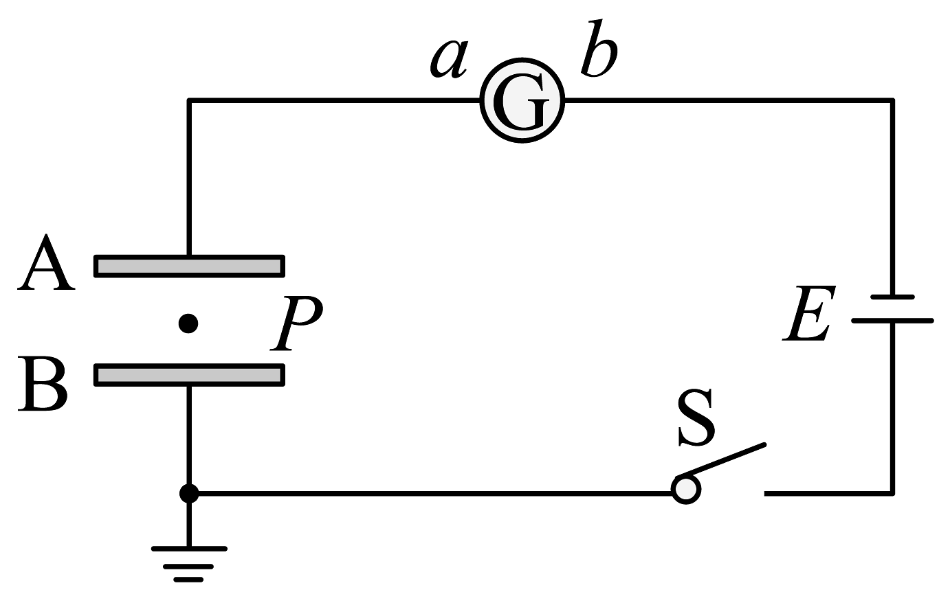 3、如图所示,两块较大的金属板A、B平行水平放置并与一电源相连S闭合后,两板间有一质量为m、电荷量为q的油滴恰好在P点处于静止状态。则下列说法正确的是( )A、在S仍闭合的情况下,若将A板向下平移一小段距离,则油滴向下加速运动,G中有b→a的电流 B、在S仍闭合的情况下,若将A板向右平移一小段距离,则油滴保存静止不动,G中有b→a的电流 C、若将S断开,且将A板向左平移一小段距离,P点电势不变 D、若将S断开,再将A板向下平移一小段距离,P点电势能变大