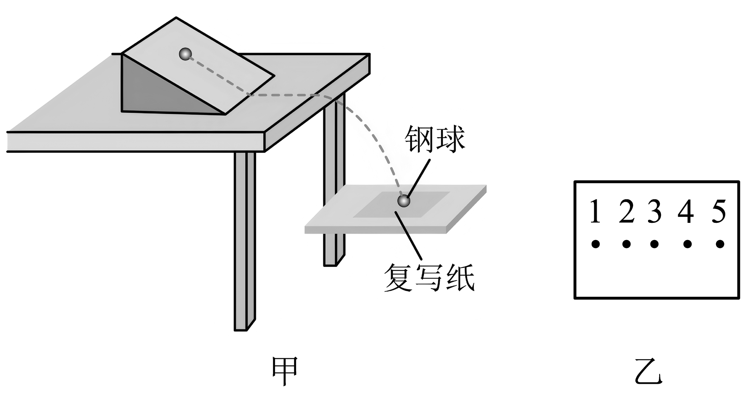 5、某同学设计的探究平抛运动规律的实验装置,如图甲所示。在水平桌面上放置一个斜面,让钢球沿斜面滚下,从桌边的相同位置滚出后做平抛运动。在钢球抛出后经过的地方水平放置一块木板(还有一个用来调节木板高度的支架,图中未画),木板上固定一张白纸,白纸上铺有复写纸。不断调整木板高度并释放钢球,在白纸上记录了多个间隔相等的落点,如图乙所示。下面说法正确的是( )A、斜面末端可以超出桌面的右边沿 B、钢球每次必须从斜面同一位置由静止释放 C、每次调整木板高度,需要同时调整木板的水平位置 D、落点1、2与落点2、3所对应的木板高度差相同