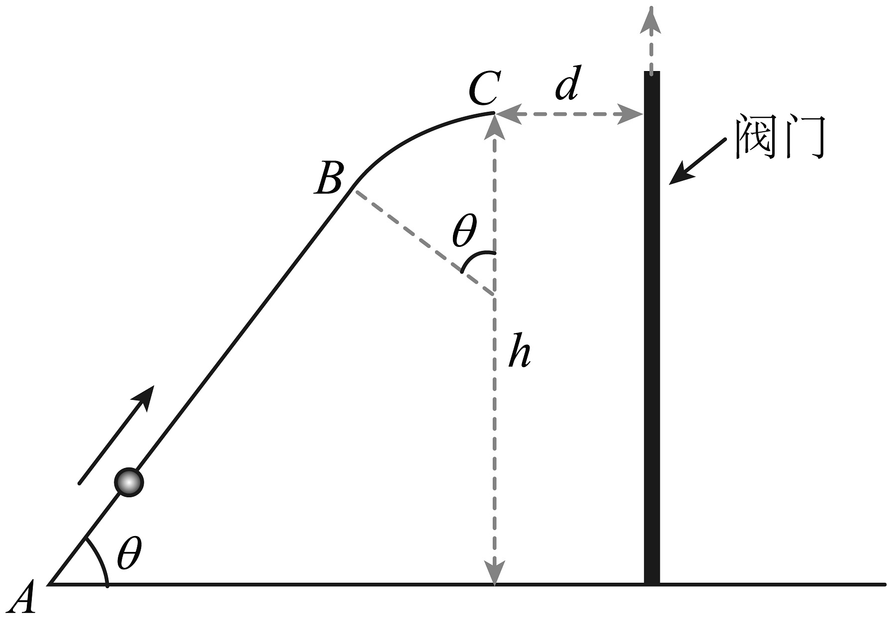 13、污水处理厂中污水管道控制系统简化为如图所示装置,倾角为θ的光滑倾斜轨道AB与半径为R的圆轨道BC平滑连接。C为圆弧轨道最高点。已知轨道AB长为L,轨道A、C两点竖直高度差为h,在C点右侧d处装有一自控阀门,初始时阀门处于关闭状态。质量为m可视为质点的小球套在轨道上,可模拟污水管中的一小段污水的运动。在C位置处有一压力开关,当小球通过C点时对轨道向上的压力达到kmg时,开关被接通,阀门向上提起。重力加速度取g。(1)、若小球以v0的初速度从A点沿斜面向上运动,求到达B点时的速度大小vB;(2)、要使得小球经过C点时压力开关接通,则小球到达C点时的速度vC至少为多少?(3)、若小球从C点以v的速度离开轨道,能直接从打开的阀门穿过,则阀门至少要用多大的加速度a竖直向上提?