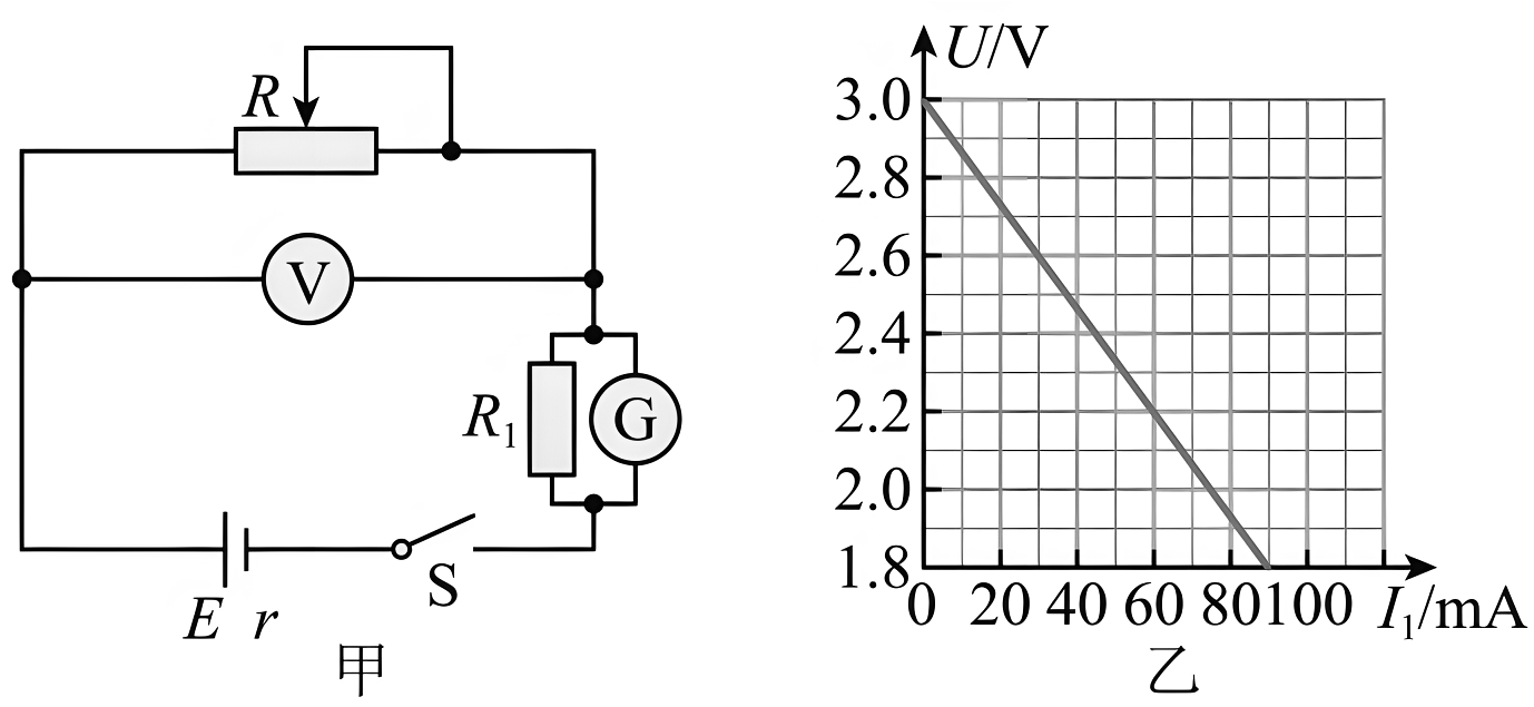 (2)在电路连接和实验操作都正确的情况下,调节滑动变阻器R,得到多组电压表V和表头G的读数,做出如题图乙所示的图像,由图像可知该电源的电动势V,内阻Ω;(均保留两位有效数字);