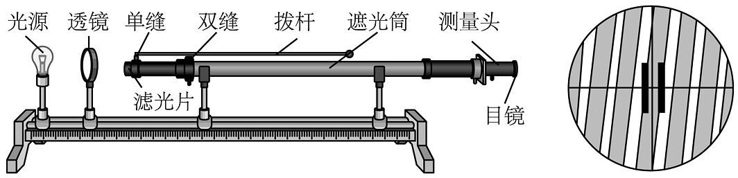 16、在“用双缝干涉测量光的波长”实验中,小华通过目镜观察单色光的干涉图样时,发现亮条纹与分划板竖线未对齐,如右图所示。若要使两者对齐,小华应( )A、仅旋转单缝 B、仅拨动拨杆 C、仅旋转测量头 D、仅转动透镜