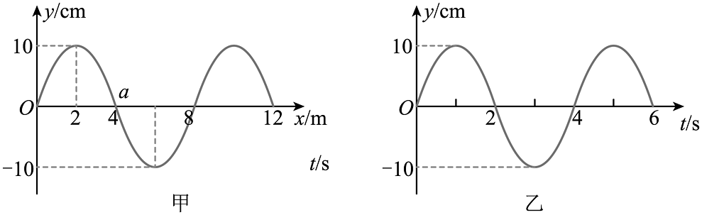 10、一列沿x轴传播的简谐横波在时的波形如图甲,平衡位置在的质点a的振动图像如图乙,求:(1)、波传播的速度大小和方向;(2)、a点在0~4s内的路程。