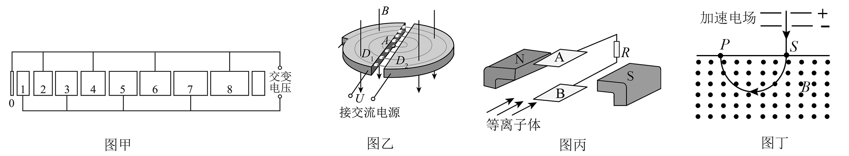 12、如图所示,图甲、乙、丙、丁分别为多级直线加速器、回旋加速器、磁流体发电机、质谱仪的原理示意图。以下说法正确的是( )A、图甲中,粒子在筒中做加速运动,电压越大获得的能量越高 B、图乙中,粒子第n次被加速前、后的轨道半径之比为 C、图丙中,将一束等离子体喷入磁场,A、B板间产生电势差,A板电势高 D、图丁中,三种粒子由静止加速射入磁场,在磁场中PS距离最大