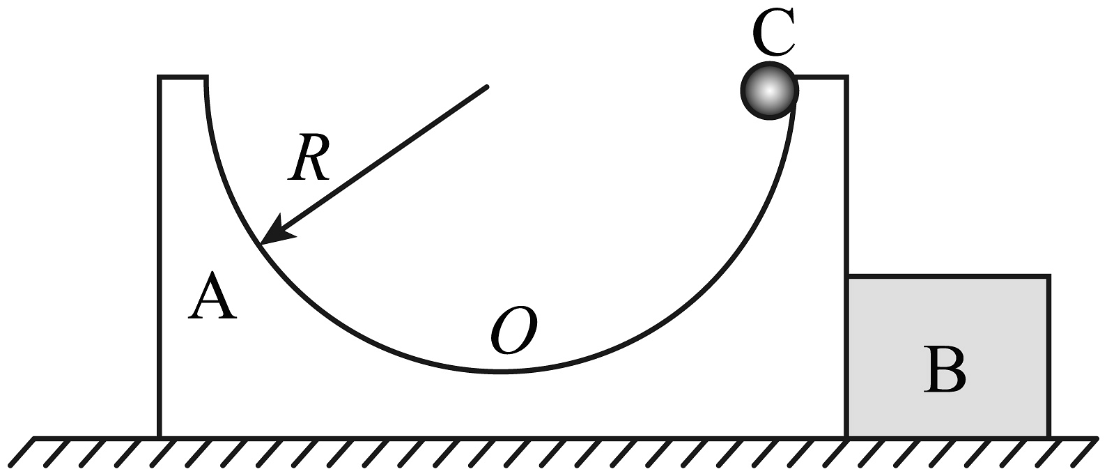 8、如图所示,半径为R的光滑半圆凹槽A和物块B紧靠着静止在光滑的水平地面上,凹槽最低点为O,A、B质量均为m。将质量为2m的光滑小球C(可视为质点)从凹槽右侧最高点由静止释放,重力加速度为g。(1)、若B固定,求C第一次滑到O点时,C的速度大小;(2)、若B不固定,当C第一次滑到O点时,求A向右运动的位移大小;(3)、若B不固定,C由静止释放到最低点的过程中,求B受到的冲量大小。