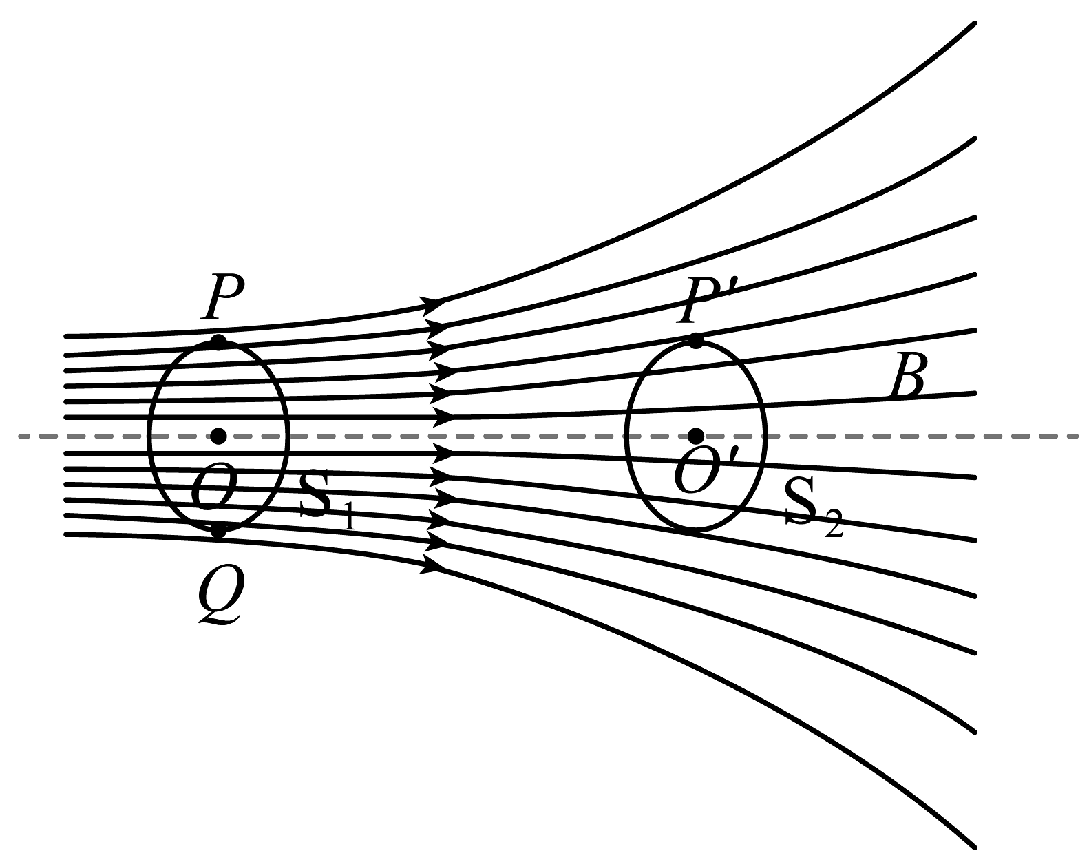 17、如图所示为某磁场磁感线分布示意图,两相同金属圆环、的圆心O、在磁场的中轴线上,两圆环环面均与中轴线垂直,点P、Q、在圆环上,P、Q关于O点对称。以下说法正确的是( )A、P、Q两点磁感应强度相同 B、P点磁感应强度比点小 C、穿过的磁通量大于穿过的磁通量 D、以PQ连线为轴旋转时,没有感应电流产生