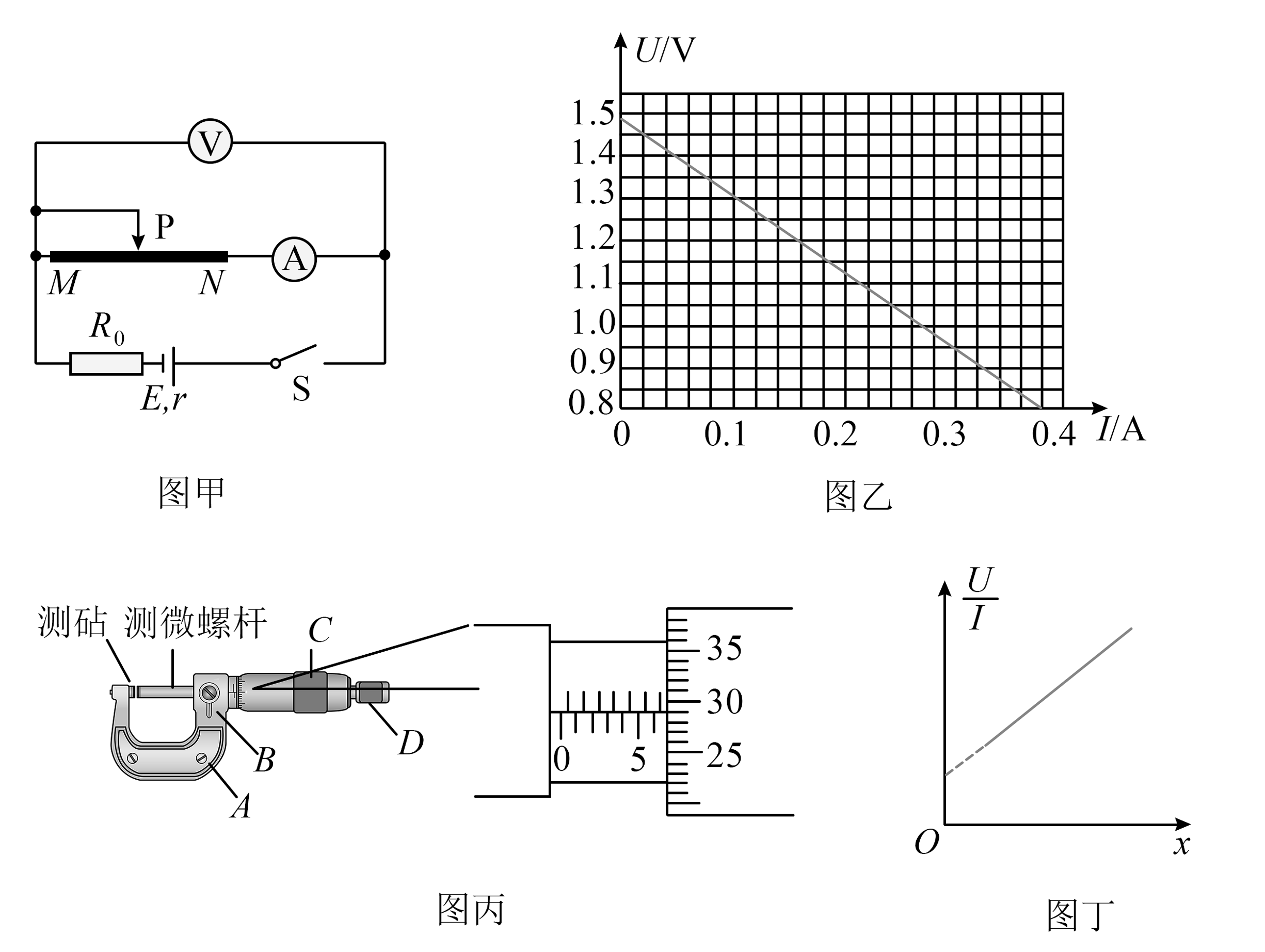11、为了测定电源的电动势、内电阻及金属丝的电阻率,某同学设计了如图甲所示的电路。其中MN为一段粗细均匀、电阻率较大的电阻丝,是阻值为0.5Ω的定值电阻。实验中调节滑片P,记录电压表示数U、电流表示数I以及对应的PN长度x,绘制了如图乙所示的图线。(1)、用螺旋测微器测量电阻丝的直径时,图丙中调节顺序为(选填“先调C后调D”或“先调D后调C”),再旋紧B,从图丙中可读出电阻丝的直径d为mm;(2)、由图乙求得电池的电动势V,内阻(结果均保留两位有效数字),由于电表内阻的影响,通过图像得到的电动势测量值真实值(选填“大于”、“等于”或“小于”);(3)、实验中作出图像如图丁所示,已知图像斜率为k,电阻丝直径为d,则电阻丝的电阻率 , 所作图线不过原点的原因是。
