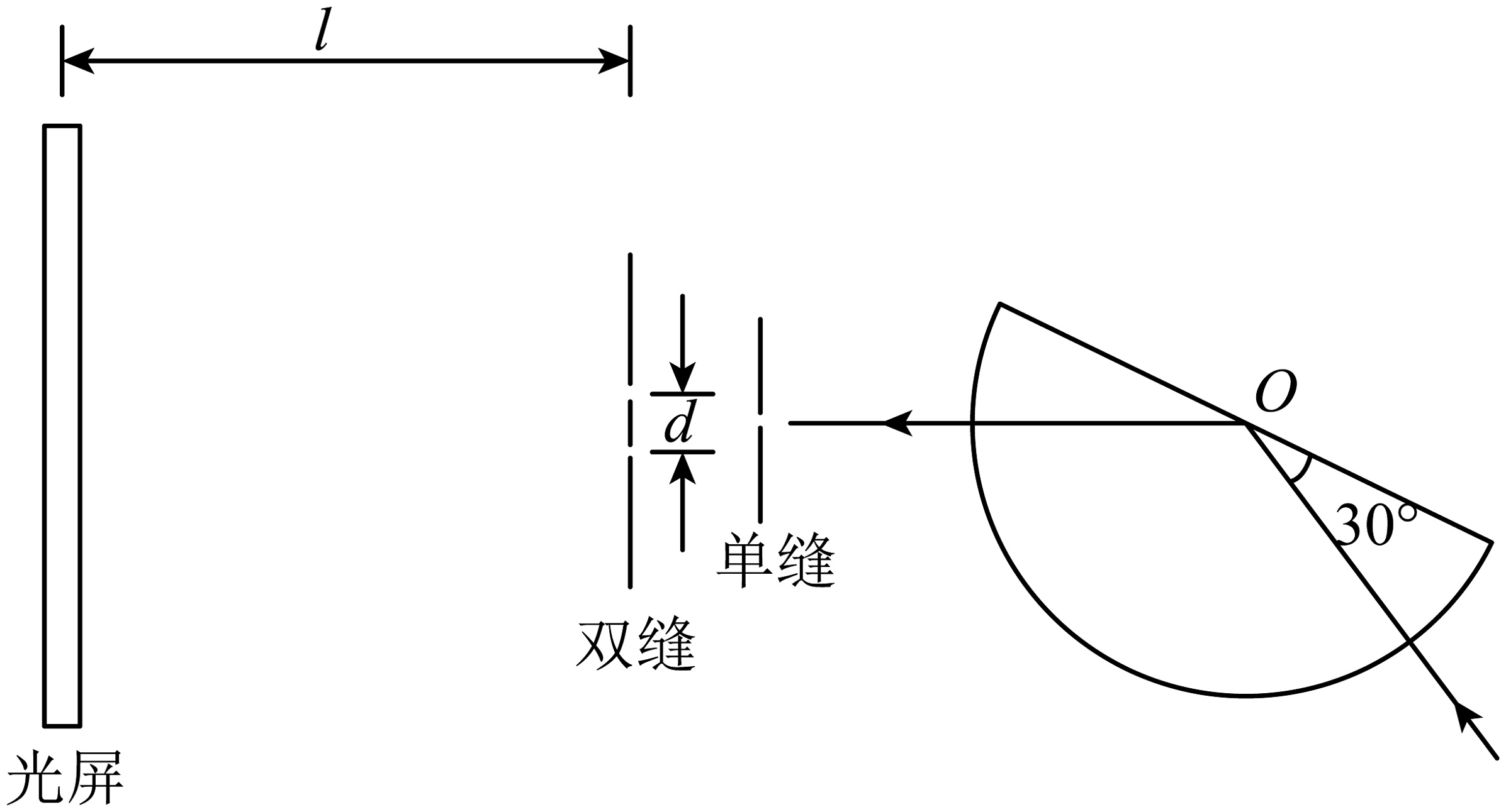 9、如图所示,一玻璃砖截面为半圆形,O为圆心,一束频率为的激光沿半径方向射入玻璃砖,入射方向与直径夹角为 , 在O点恰好发生全反射,水平射出后,进入双缝干涉装置。已知双缝间距 , 光屏离双缝 , 光在真空中的传播速度为。求:(1)、玻璃砖的折射率n(结果可保留根号);(2)、光屏上相邻亮条纹的间距。