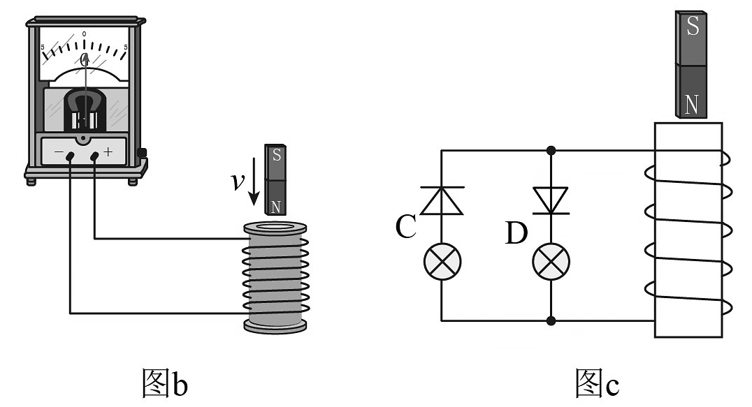 (4)丙同学设计了如图所示的装置来判断感应电流的方向。他先使用多用电表的欧姆挡对二极管正负极进行确认,某次测量时发现多用电表指针几乎没有偏转,说明此时黑表笔接触的是二极管的(选填“正极”或“负极”)。实验操作时将磁铁插入线圈时,只有灯(选填“C”或“D”)短暂亮起。