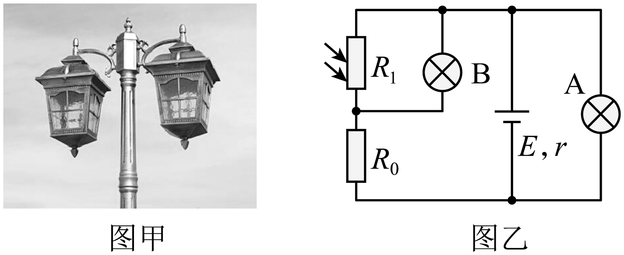 2、如图甲,为某地新装的一批节能路灯,该路灯通过光控开关实现自动控制,电灯的亮度可自动随周围环境的亮度改变而改变。如图乙,为其内部电路简化原理图,电源电动势为E,内阻为r,为光敏电阻(光照强度增加时,其电阻值减小)。现减少光照强度,灯泡电阻不变,则下列判断正确的是( )A、A、B灯都变暗 B、A、B灯都变亮 C、电源的总功率变大 D、电源的效率变大