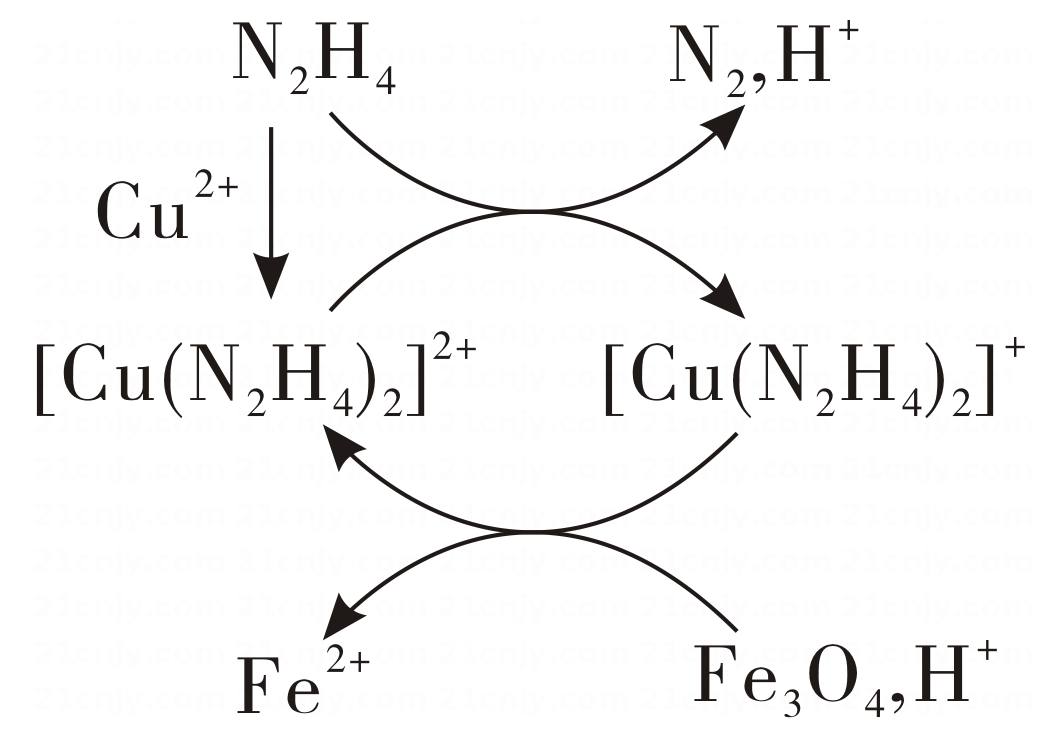 9、用肼(N2H4)的水溶液处理核冷却系统内壁上的铁氧化物时,通常加入少量CuSO4 , 反应原理如图所示。下列说法正确的是( )A、N2是还原反应的产物 B、还原性:N2H4<Fe2+ C、处理后溶液的pH增大 D、图示反应过程中起催化作用的是Cu2+