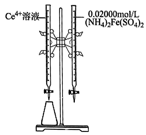 (3)、“沉淀”时,向溶液加入约为8的溶液,反应可生成沉淀,写出该反应的离子方程式。(4)、实验中需要测定溶液中的含量。已知水溶液中可用准确浓度的溶液滴定。以苯代邻氨基苯甲酸为指示剂,滴定终点时溶液由紫红色变为亮黄色,滴定反应为。请补充完整实验方案:①准确量取溶液约为 , 加氧化剂将完全氧化并去除多余氧化剂后,用稀硫酸酸化,将溶液完全转移到容量瓶后定容。