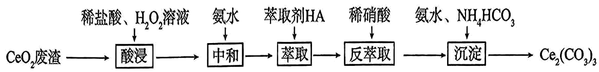 20、实验室以二氧化铈废渣为原料制备 , 实验过程如下:(1)、“酸浸”时与反应生成并放出 , 该反应的化学方程式为。(2)、通过中和、萃取、反萃取、沉淀等过程,可制得。已知能被有机萃取剂(简称)萃取,其萃取原理可表示为: