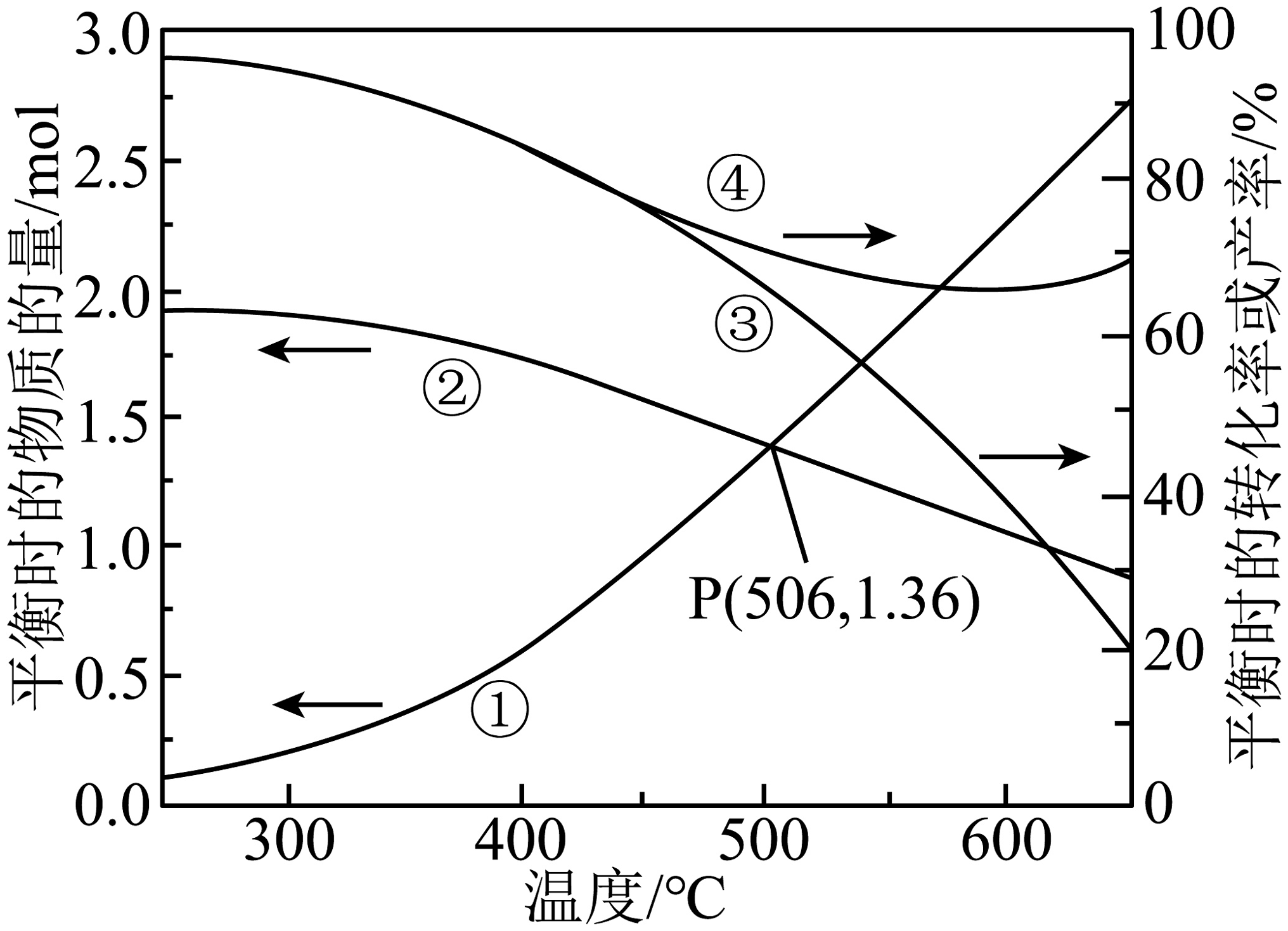 还原能力可衡量转化效率,(同一时段内与的物质的量变化量之比)。常压下和按物质的量之比1:3投料,某一时段内和的转化率随温度变化如下图1,时的值为 , 请在下图2中画出间的变化趋势,并标明时值。