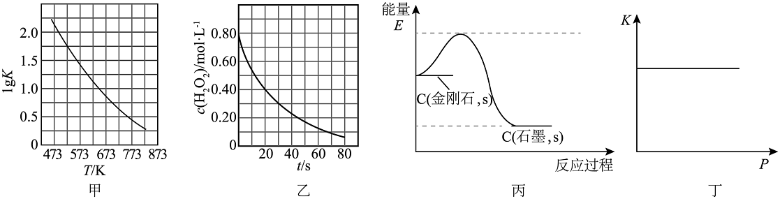 10、根据下列图示所得出的结论正确的是A、图甲是CO(g)+H2O(g)CO2(g)+H2(g)的平衡常数与反应温度的关系曲线,说明该反应的△H<0 B、图乙是室温下H2O2催化分解放出氧气的反应中c(H2O2)随反应时间变化的曲线,说明随着反应的进行H2O2分解速率逐渐减小 C、图丙为C(金刚石,s)=C(石墨,s)△H=-1.9kJ·mol-1反应过程的能量变化曲线,说明金刚石比石墨稳定 D、图丁是一定温度时某反应的平衡常数K随压强增大而保持不变,说明该反应反应前后气体体积一定不变