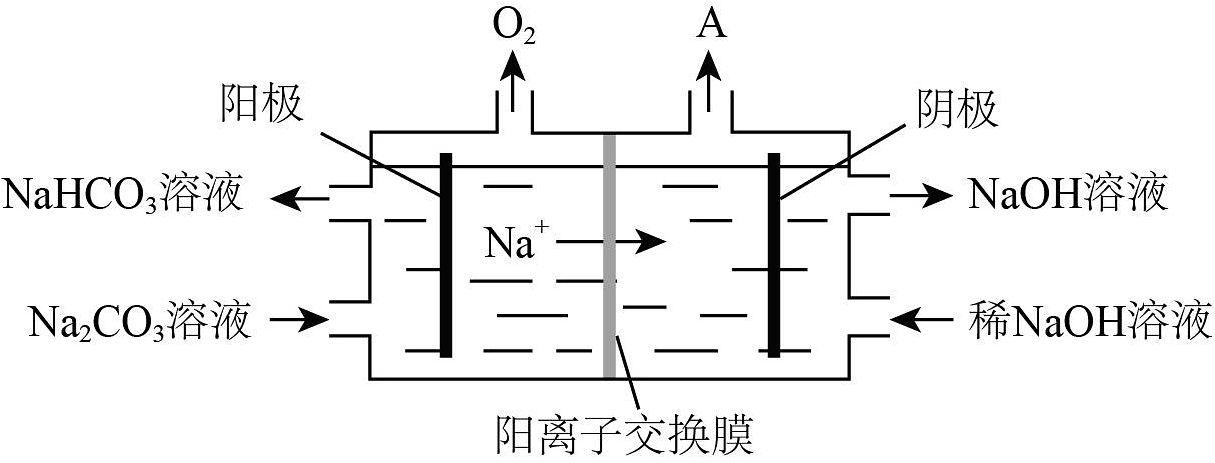 (1)、“碱溶”时生成四羟基合铝酸钠Na[Al(OH)4]的离子方程式为。(2)、向“过滤所得滤液中加入NaHCO3溶液,生成Na2CO3和Al(OH)3 , 加入NaHCO3后溶液的pH(填“增大”、“不变”或“减小”)。已知:pH=-1gc(H+)。(3)、“电解”是电解熔融Al2O3 , 电解过程中作阳极的石墨易消耗,原因是。(4)、“电解”是电解Na2CO3溶液,原理如图所示。①阳极的电极反应式为 , ②阴极产生的物质A的化学式为。(5)、铝粉在1000℃时可与N2反应制备AlN。在铝粉中添加少量NH4Cl固体并充分混合,有利于AlN的制备,其主要原因是。 -