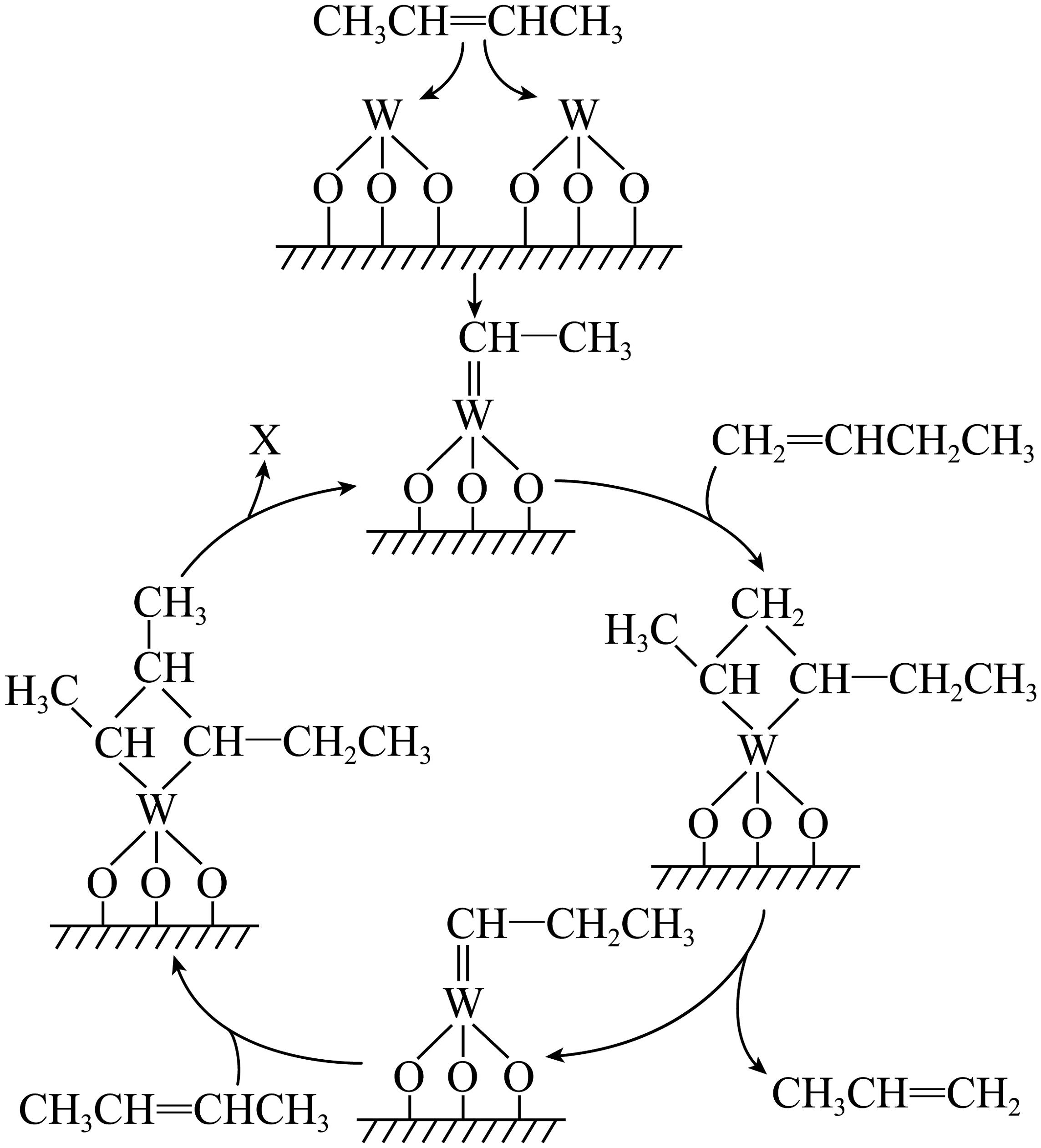 16、在WO3/SiO2催化作用下,丁烯发生催化歧化反应的机理如图所示。下列有关该机理描述的转化过程中的说法不正确的是A、可将2-丁烯转化为1-丁烯 B、整个过程中W的化合价发生了变化 C、有机物X为2-戊烯 D、存在σ键和π键的断裂及形成