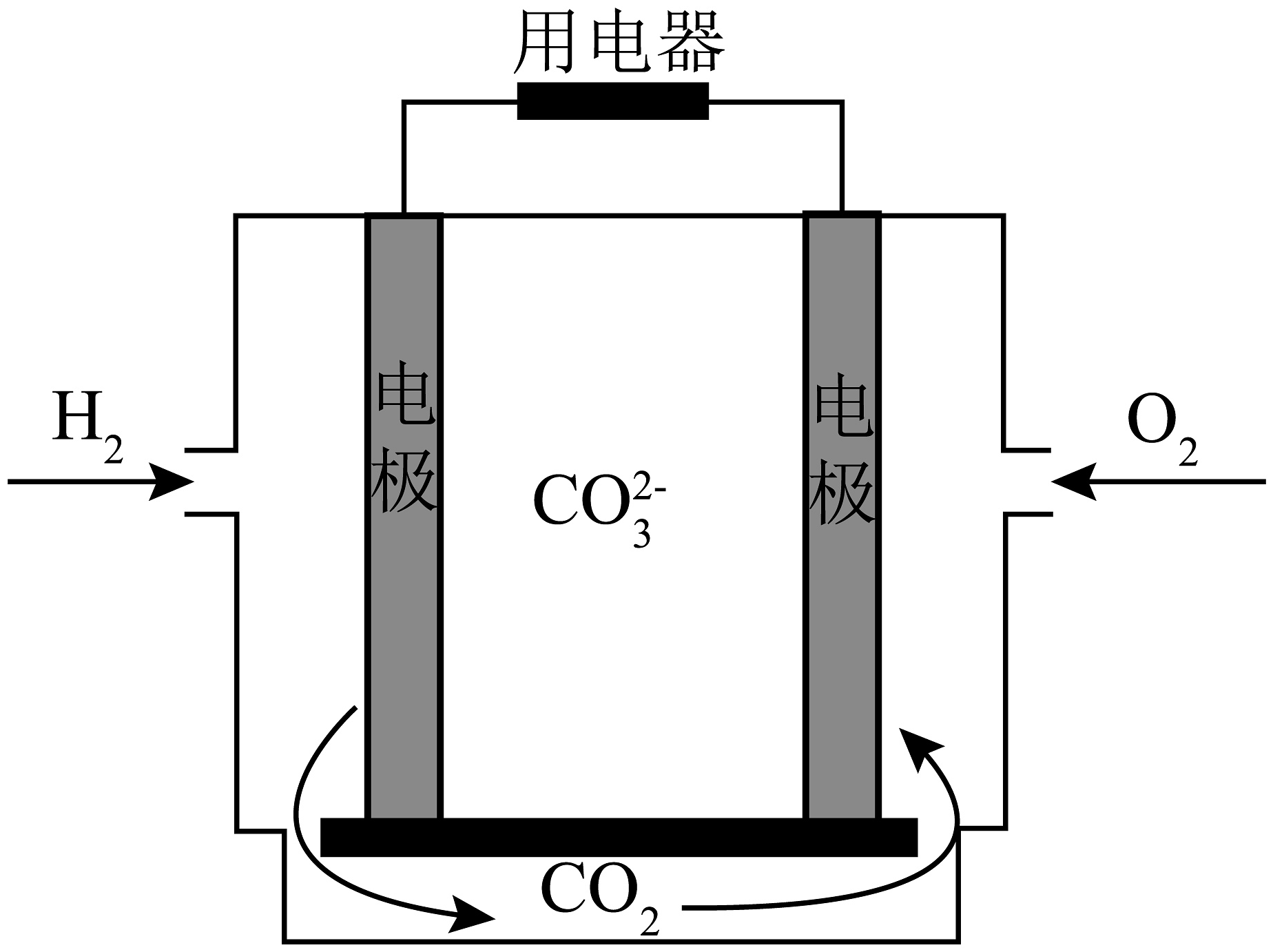 (5)、氢能的高效利用途径之一是在燃料电池中产生电能。某研究小组的自制熔融碳酸盐燃料电池工作原理如图所示:正极上的电极反应式是。该电池以3.2A恒定电流工作14分钟,消耗H2体积为0.49L,故可测得该电池将化学能转化为电能的转化率为[已知:该条件下H2的摩尔体积为24.5L/mol;电荷量q(C)=电流I(A)×时间(⒅);NA=6.0×1023mol;e=1.60×10-19C]。