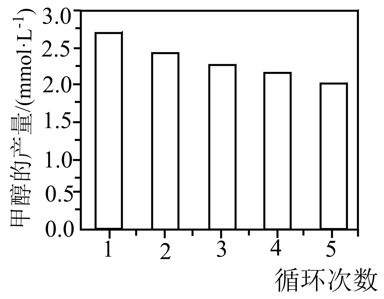 (3)、CO2加氢制甲醇催化剂的研究。用Co-C作催化剂,可得到含少量甲酸的甲醇,相同条件下,将催化剂循环使用,甲醇产量与催化剂循环次数的关系如图所示,甲醇产量随循环次数增加而减小的原因可能是。