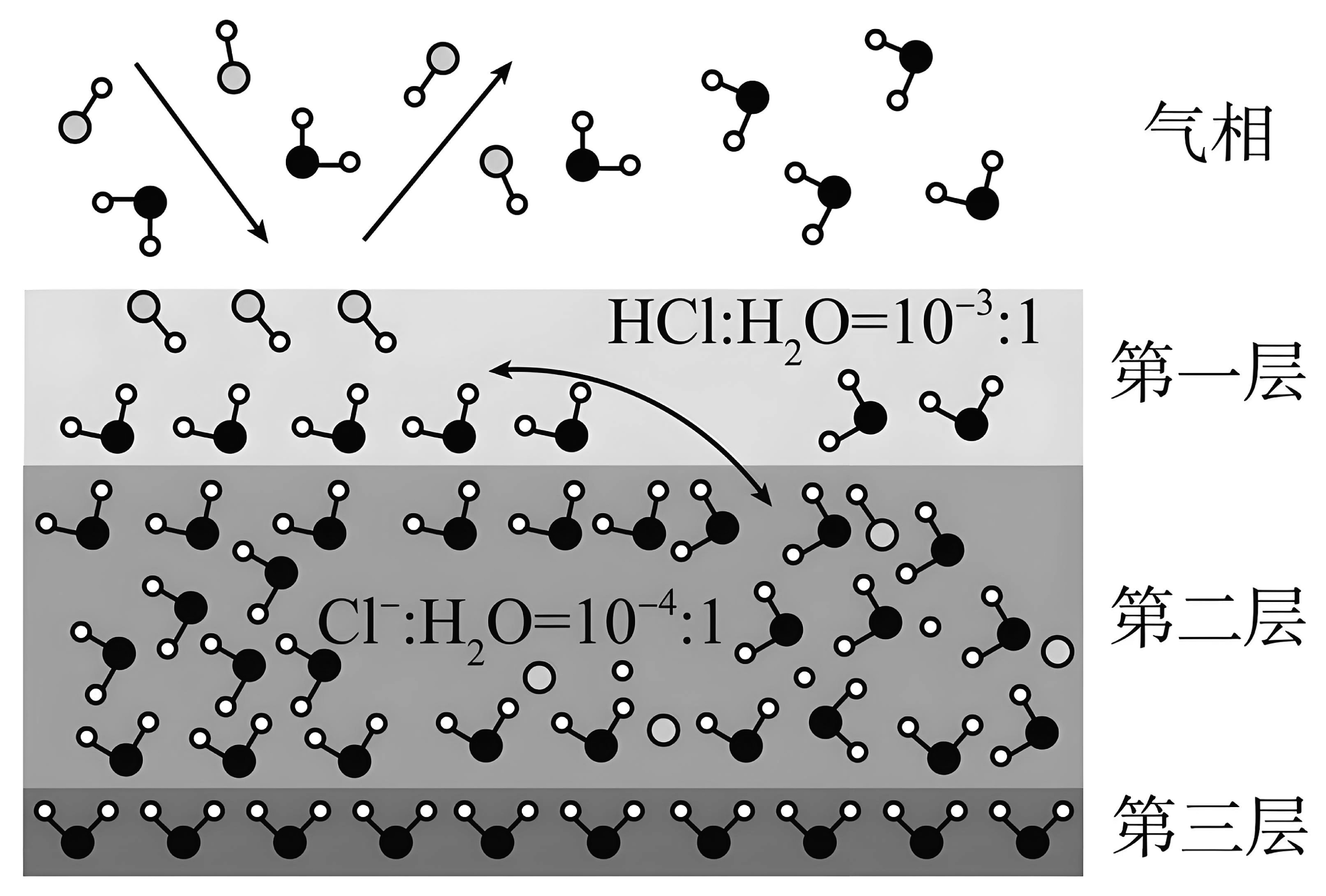 10、固体界面上强酸的吸附和离解是多相化学在环境、催化、材料科学等领域研究的重要课题。如图为少量气体分子在冰表面吸附和溶解过程的示意图(图中比例为微粒个数比),下列叙述不正确的是A、冰表面第一层中,以分子形式存在 B、在冰中的电离方程式是: C、冰表面第二层中,浓度为(设冰的密度为) D、冰表面第三层中无分子