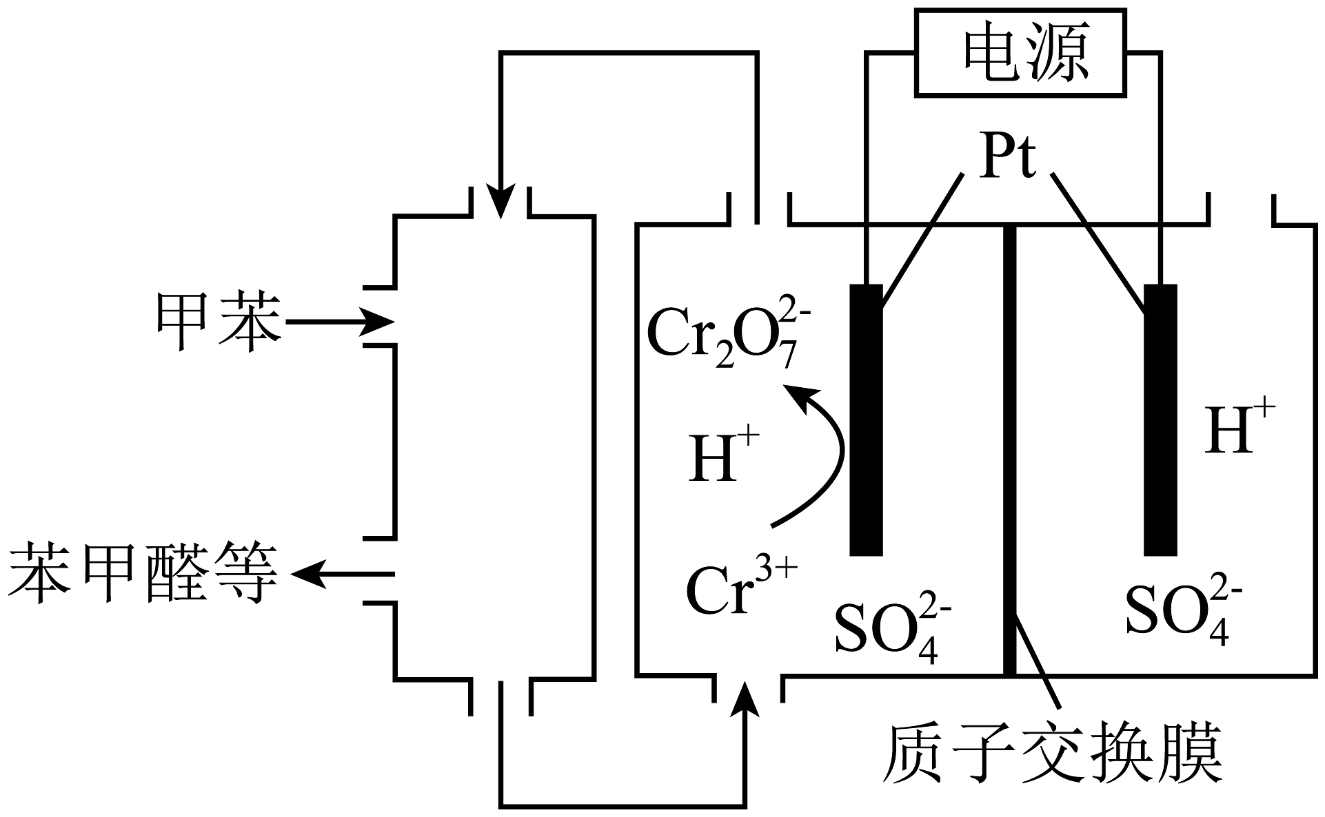 A、电解时的阳极反应为:2Cr3++6e-+7H2O=+14H+ B、电解结束后,阴极区溶液pH升高 C、1 mol甲苯氧化为0.5 mol苯甲醛和0.5 mol苯甲酸时,共消耗mol D、甲苯、苯甲醛、苯甲酸的混合物可以通过分液的方法分离 -