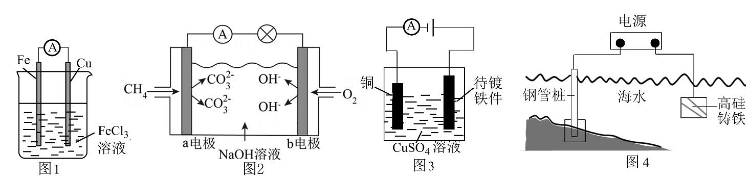 8、关于如图所示各装置的叙述正确的是A、图1是化学能转变为电能的装置,总反应为Cu+2Fe3+=Cu2++2Fe2+ B、图2CH4-O2碱性燃料电池电子由a电极经NaOH溶液流向b电极 C、图3装置可在铁件表面镀铜,CuSO4溶液浓度不变 D、图4支撑海港码头基础的钢管桩与电源的负极相连,以防止被海水腐蚀