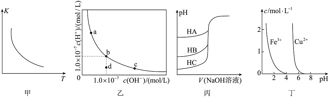 2、根据下列图示所得出的结论不正确的是A、图甲是一定条件下的平衡常数K随温度变化的曲线,可推知该反应的 B、图乙是一定温度下水溶液中、的变化曲线。该温度下,加水稀释NaOH溶液可能引起沿曲线由c向b的变化 C、图丙是室温下用0.01mol/L NaOH溶液分别滴定同浓度同体积的HA、HB、HC三种酸的滴定曲线,可推知HA的酸性最强 D、图丁是在溶液中、的浓度与pH的关系曲线。可推知用氢氧化物沉淀除去溶液混有的 , 所调pH的范围大致应为4~5