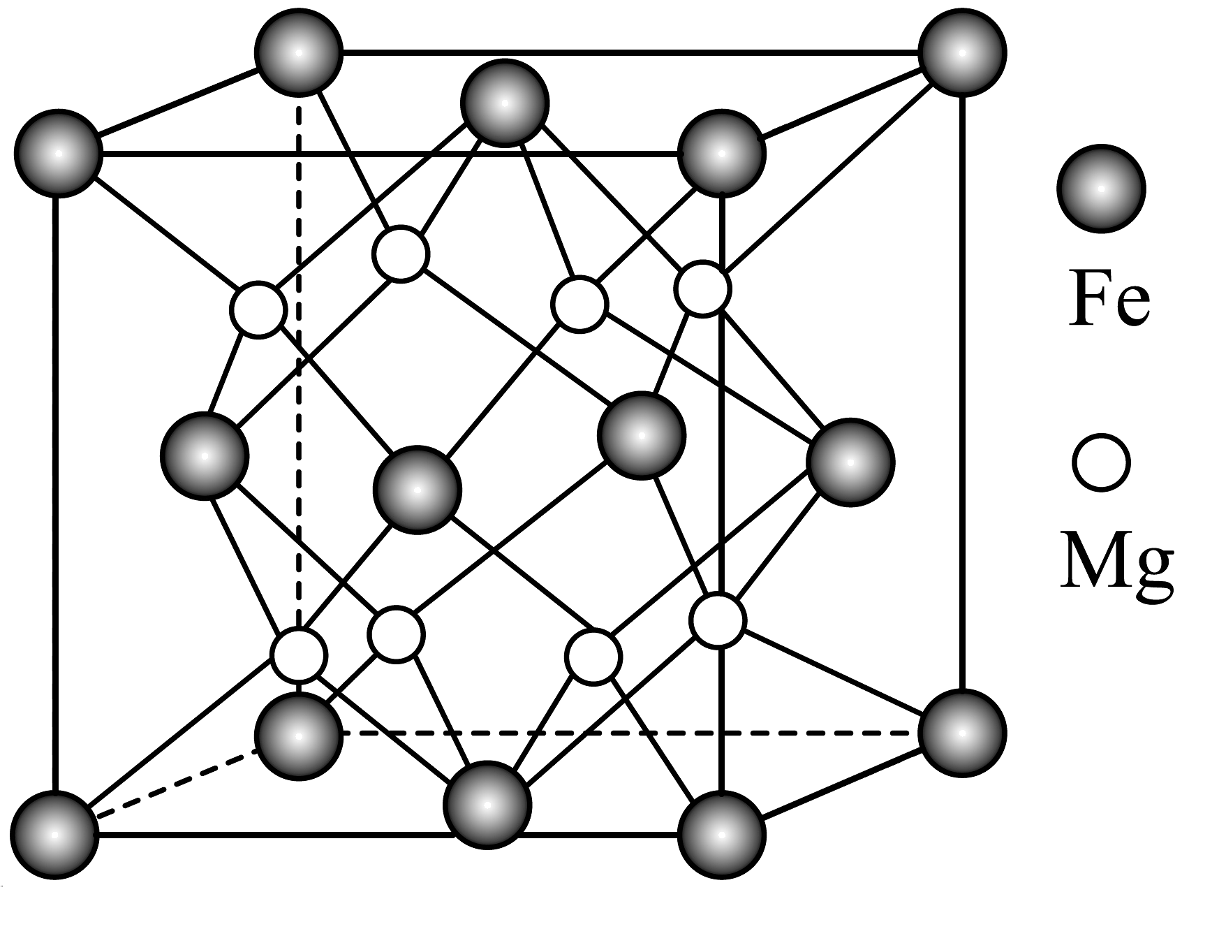 20、铁及其化合物在生活中有广泛应用。(1)、Fe元素在周期表中的位置是 , 位于元素周期表区。(2)、铁镁合金是目前储氢密度最高的材料之一,其晶胞结构如图所示。储氢时,H2分子位于晶胞体心和棱的中心位置。该合金储满氢后所得晶体的化学式是。(3)、实验室用KSCN溶液、苯酚检验Fe3+。