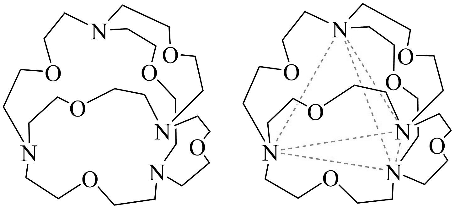 (3)、下图表示某种含氮有机物的结构,其分子内4个氮原子分别位于正四面体的4个顶点,分子内存在空腔,能嵌入某离子或某分子并形成4个氢键予以识别。下列分子或离子中,能被该有机物识别的是___________(填字母)。A、CF4 B、CH4 C、 D、H2O -