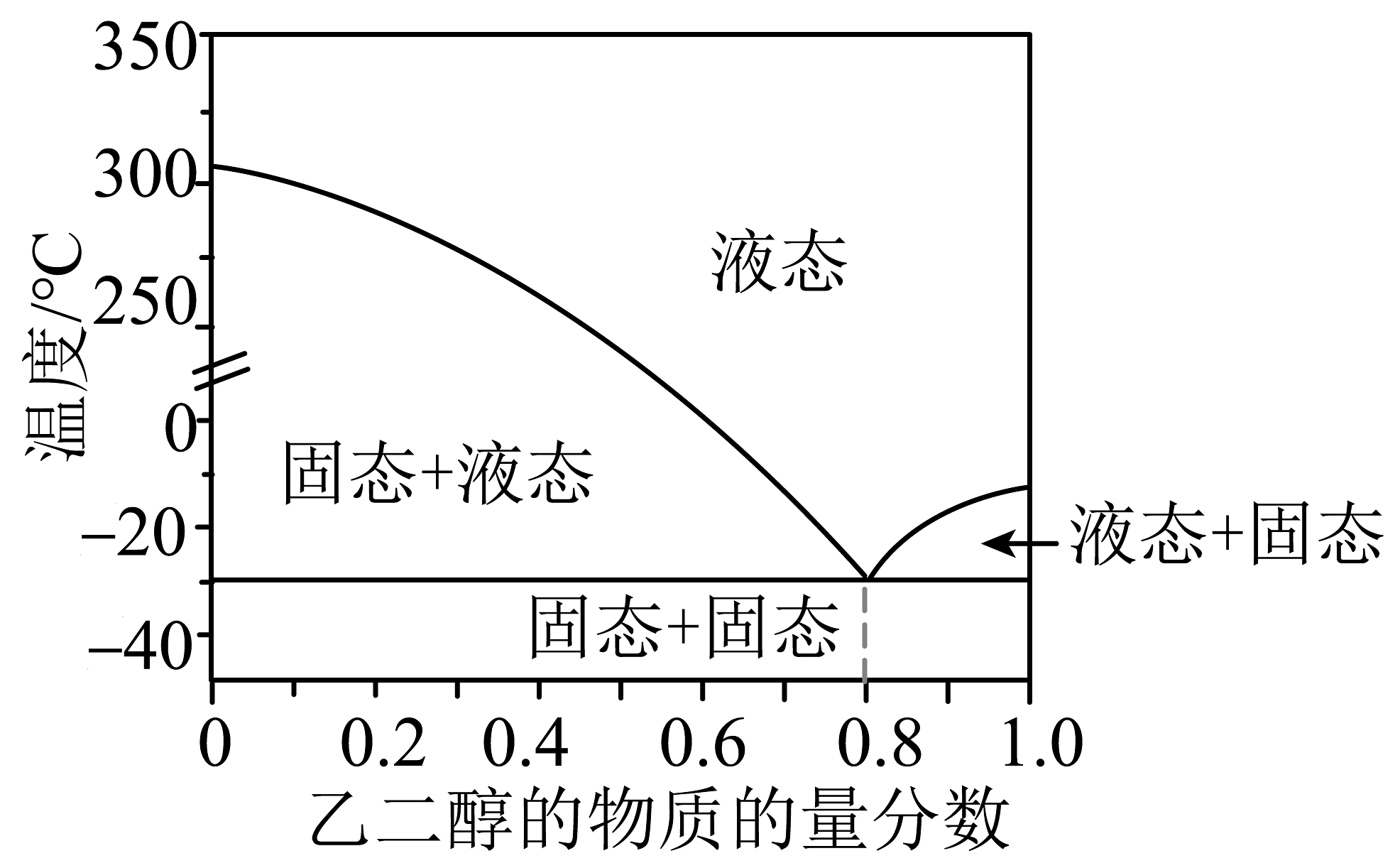 ② 不同配比氯化胆碱与乙二醇混合的二元相图如图所示。相同条件下,氯化胆碱的熔点(填“>”“=”或“<”)乙二醇的熔点。制备熔点达到最低值的DESs时,氯化胆碱与乙二醇的物质的量之比为。