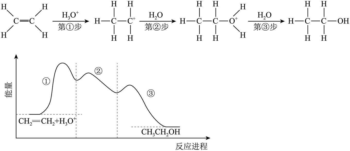 7、乙烯在酸催化下水合制乙醇的反应机理如下,能量与反应进程的关系如图所示,下列说法正确的是A、A中所有碳原子的杂化方式均为sp3 B、第①步反应只断裂了碳碳键 C、总反应的ΔH<0,说明反应物的键能总和小于生成物的键能总和 D、乙烯在酸催化下水合制乙醇一定不需要加热就能进行