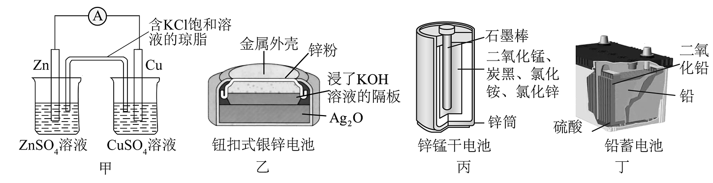 15、下列有关原电池的说法不正确的是A、图甲所示装置中,盐桥中的向盛有溶液的烧杯中移动 B、图乙所示装置中,正极的电极反应式为 C、图丙所示装置中,使用一段时间后,锌筒会变薄 D、图丁所示装置中,使用一段时间后,电解质溶液的酸性减弱,导电能力下降