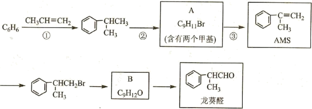 10、α-甲基苯乙烯(AMS)在有机合成中用途广泛,以下是用苯为原料合成AMS并进一步制备香料龙葵醛的路线:(1)、 反应①的反应类型是;B中含氧官能团的名称为。(2)、写出反应③的方程式。(3)、检验龙葵醛中官能团可选择的试剂是。(4)、写出由B制备龙葵醛的化学反应方程式。(5)、AMS 可以自身聚合,写出该高聚物的结构简式: 。(6)、B在一定条件下也可以直接制备AMS,反应所需条件为。(7)、写出符合下列条件的A的一种同分异构体的结构简式。