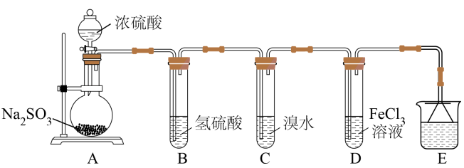 (1)、A装置中浓硫酸表现出性(填“酸”“氧化”或“还原”)。(2)、E装置盛放的溶液可以为;倒置的漏斗作用是。(3)、B装置中的现象是 , 发生反应的化学方程式为。(4)、C装置中溶液褪色,发生反应: , 在该反应中,氧化产物与还原产物的物质的量之比为。(5)、D装置中黄色溶液变为浅绿色,发生反应的离子方程式为。设计实验检验反应后的溶液中是否有:。 -