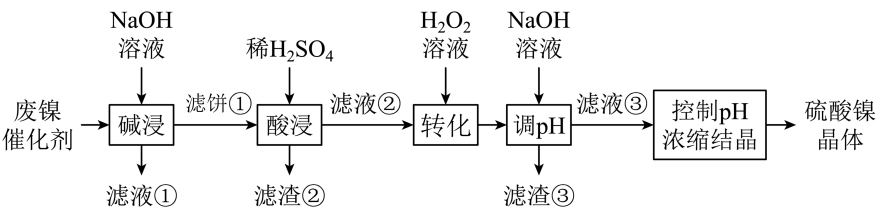(1)、“碱浸”时发生的主要反应的离子方程式为。(2)、“滤液②”中含有的金属离子是。(3)、若“转化”后的溶液中浓度为 , 则“调”应控制的范围是。(4)、资料显示,硫酸镍结晶水合物的形态与温度有如下关系。温度