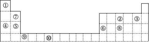 11、如表是元素周期表的一部分,表中所列的数字分别代表某一种元素。针对表中①﹣⑩号元素回答下列问题。(1)、⑩元素的名称是 , ⑨元素的原子结构示意图为 。(2)、②、③、④、⑤、⑥五种元素中,原子半径由小到大的顺序是 (填元素符号);这五种元素分别形成的简单离子中离子半径最小的是 (填离子符号)。(3)、某些不同族元素的性质也有一定的相似性,如表中元素⑦与元素⑥的氢氧化物有相似的性质,请写出元素⑦的氢氧化物与NaOH溶液反应的化学方程式:。(4)、元素①和④的单质化合形成的化合物能与水反应生成氢气,向反应后的溶液中滴入酚酞,溶液变红。(5)、元素④和⑥相比,金属性较强的是 (填元素符号),下列能证明这一事实的有 (填序号)。