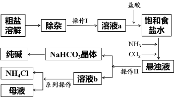 (1)、除杂需要加入过量的除杂试剂。上述流程图中“除杂”步骤中可依次加入过量的NaOH、、(填化学式);操作Ⅰ的名称是。(2)、写出“溶液a”中加入盐酸发生反应的离子方程式;写出由晶体获取纯碱的化学方程式。(3)、“溶液b”中除和外,还含有的离子主要有。(4)、上述工艺流程中可循环利用的物质有。 -