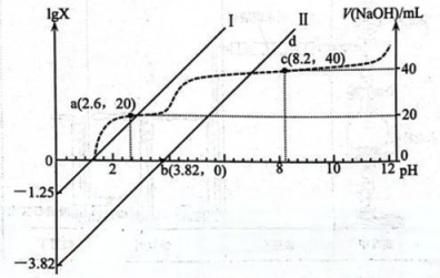 7、常温下,向20.00mL0.100mol/L的乙二酸()溶液中滴加同浓度的NaOH溶液,过程中lgX(X为或)、V(NaOH)与pH的变化关系如图所示。下列说法错误的是( )A、直线Ⅰ中X表示 B、乙二酸的 C、c点溶液中 D、pH=7时,