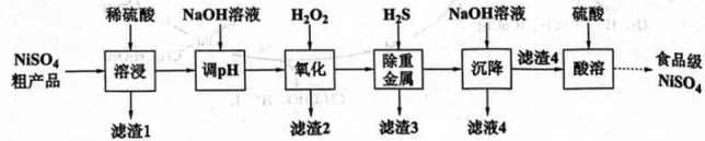 6、镍元素作为人体必需的微量元素之一,具有促进红细胞再生、维持大分子结构和膜结构稳定等重要作用。通过对硫酸镍粗产品(主要成分为 , 含As、Fe、Pb、Cd、Hg等元素)的提纯可制得食品级硫酸镍,其工艺路线如下: