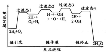 (2)、某文献报道,可在电解甲烷制氢,原理如下图所示。其中熔融电解质可传导和电极为极(填“阴”或“阳”),电极反应式为。(3)、火箭推进器中氢气燃烧的机理如下图,链式反应共4步。从键能角度分析,“链引发”是断键而不是断键的原因是;“链传递”分两步完成,第一步的反应方程式为 . -