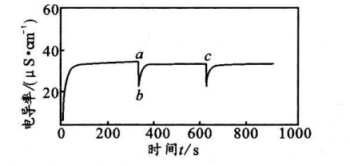 6、常温下,向蒸馏水中加入碳酸钙粉末,测得电导率变化如下图,并于时刻再加入一定体积蒸馏水,体系一直保持浑浊。下列说法错误的是( )A、100~200s时间内,电导率不变,说明碳酸钙达到溶解平衡状态 B、加水后电导率变小,此时为不饱和溶液 C、点之后电导率增加,说明碳酸钙溶解度增大 D、忽略碳酸钙溶解时的热效应,整个实验过程中,保持不变