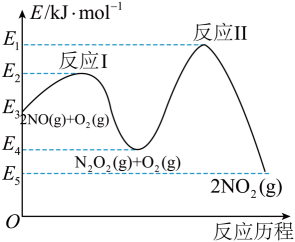 (3)、NO在空气中存在如下反应:2NO(g)+O2(g)2NO2(g),该反应分两步完成,其反应历程如图所示:则决定总反应的速率这一步的热化学方程式为:。(4)、在汽车上安装三效催化转化器,可使汽车尾气中的主要污染物(CO、NOx、碳氢化合物)进行相互反应,生成无毒物质,减少汽车尾气污染。发生以下反应:Ⅰ.N(g)+O2(g)2NO(g) △H1