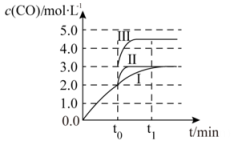 (3)、在3L容积可变的密闭容器中仅发生反应②,已知c(CO)与反应时间t的变化曲线I如右图所示,若在t0时刻分别改变一个条件,则曲线Ⅰ可变为曲线Ⅱ和曲线Ⅲ。当曲线I变为曲线Ⅱ时,改变的条件是。当曲线Ⅰ变为曲线Ⅲ时,改变的条件是。(4)、一定条件下将(g)和(g)以体积比3∶1置于恒温恒容的密闭容器发生反应③,下列能说明该反应达到平衡状态的有____A、体系密度保持不变 B、和的体积比保持不变 C、混合气体的平均相对分子量不变时,反应一定达到平衡状态 D、当破坏中2个碳氧双键,同时破坏中的2个氧氢键,反应一定达到平衡状态(5)、一定条件下,甲醇与一氧化碳反应可以合成醋酸。通常状况下,将a mol·L-1的醋酸与b mol·L-1 Ba(OH)2溶液等体积混合,反应平衡时,2c(Ba2+)= c (CH3COO- ),用含a和b的代数式表示该混合溶液中醋酸的电离常数为。 -