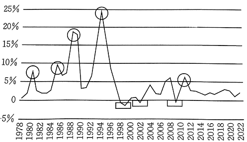 5、下图所示为某学者根据国家统计局相关数据整理的我国物价水平的变动幅度(1978—2022年)。对表中数据解读最准确的是( )