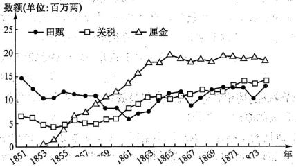 13、下面为 1851年至 1873年清政府财政收入结构变化趋势图。下列对该图解读合理的是( )